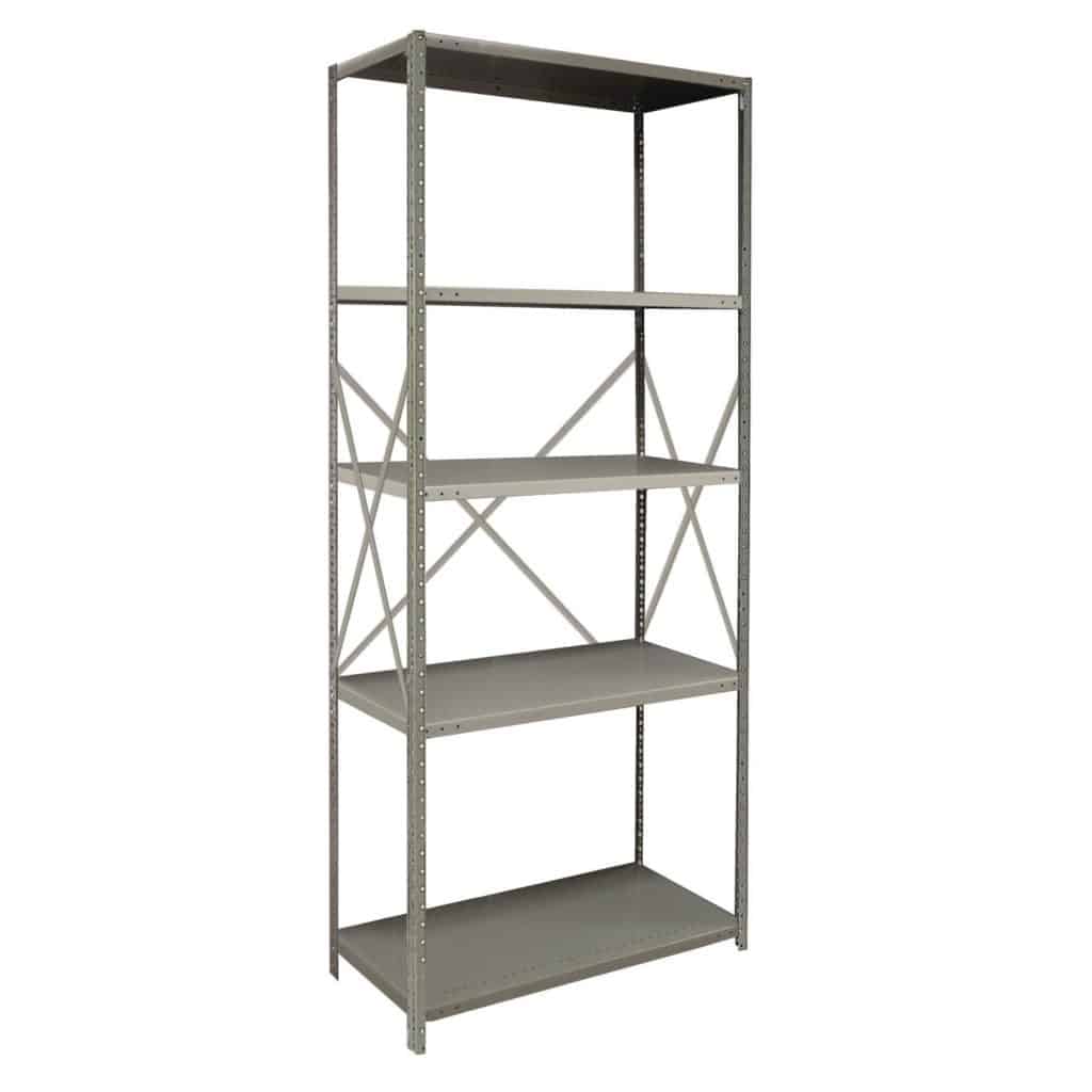 The 2000 series open steel shelving angle post starter includes 5 heavy-duty shelves Our 20-gauge heavy-duty are ideal for storing heavier items such as tool boxes and large parts. The patented box design of our Industrial Metal Shelves provides added strength in both the front and rear of the shelf. The lapped and welded corners provide extra strength and durability.
