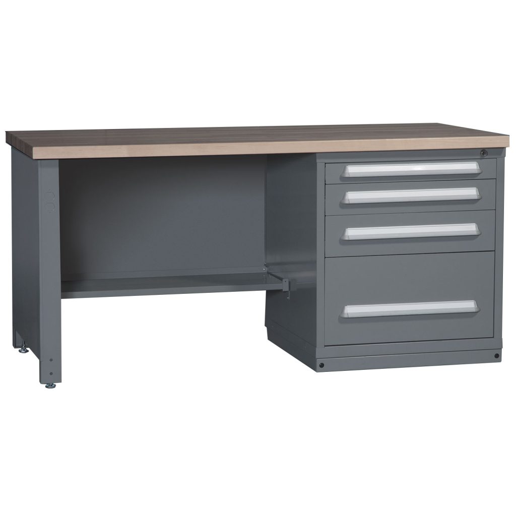 The standard wide modular cabinet of the 72 inch wide hardwood top industrial workbench includes 4 drawers. These steel drawers slide open on smooth, steel glides. Each heavy-duty drawer can hold up to 400 lbs. All of the drawers fully extend to give easy access to the entire contents of the drawer. The aluminum handles include rounded end caps and will withstand years of use. Each cabinet includes both removable labels and plastic shields for the handles.