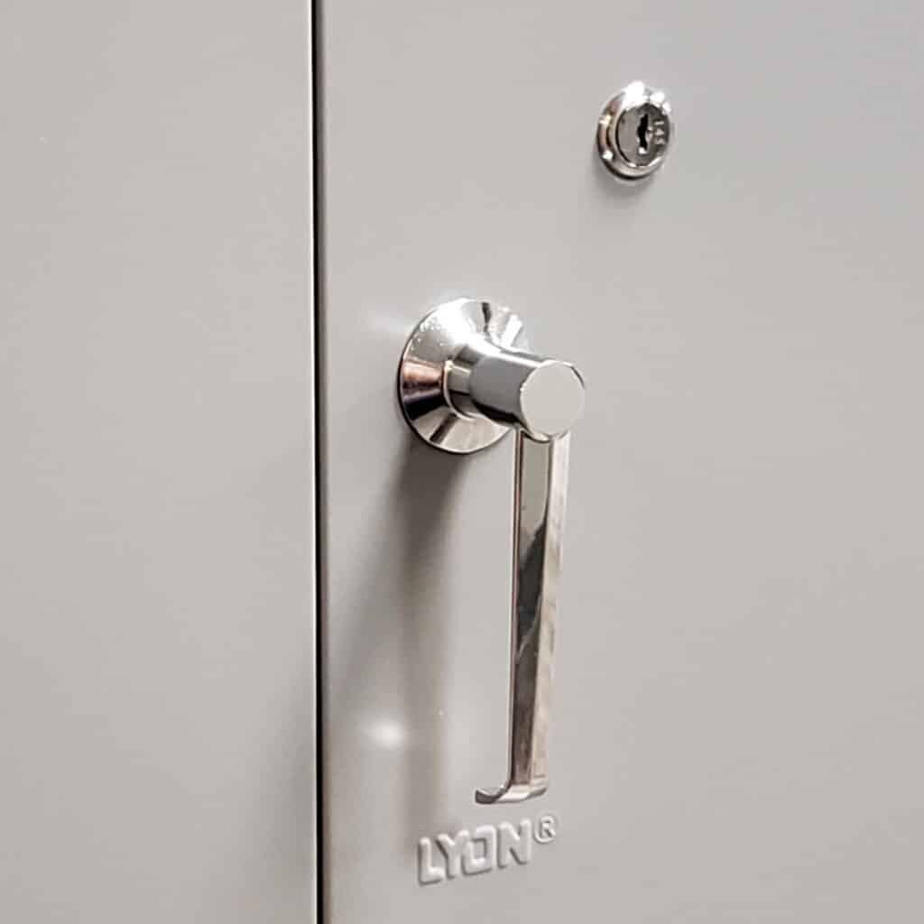 The polished chrome plated handle easily turns to hold the doors closed. Handle kit includes a chrome plated handle and attachment hardware. The NF1054 kit also fits on the Lyon 1000 series cabinets.
